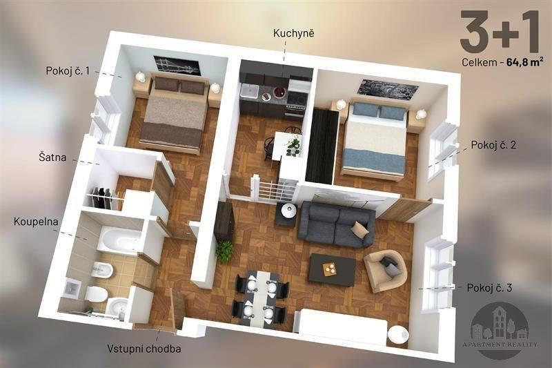 Nabízíme byt 3+1, který se skládá se ze vstupní chodby, obývacího pokoje, kuchyně, 2 ložnic, šatny a koupelny se vanou, WC a bidetem.